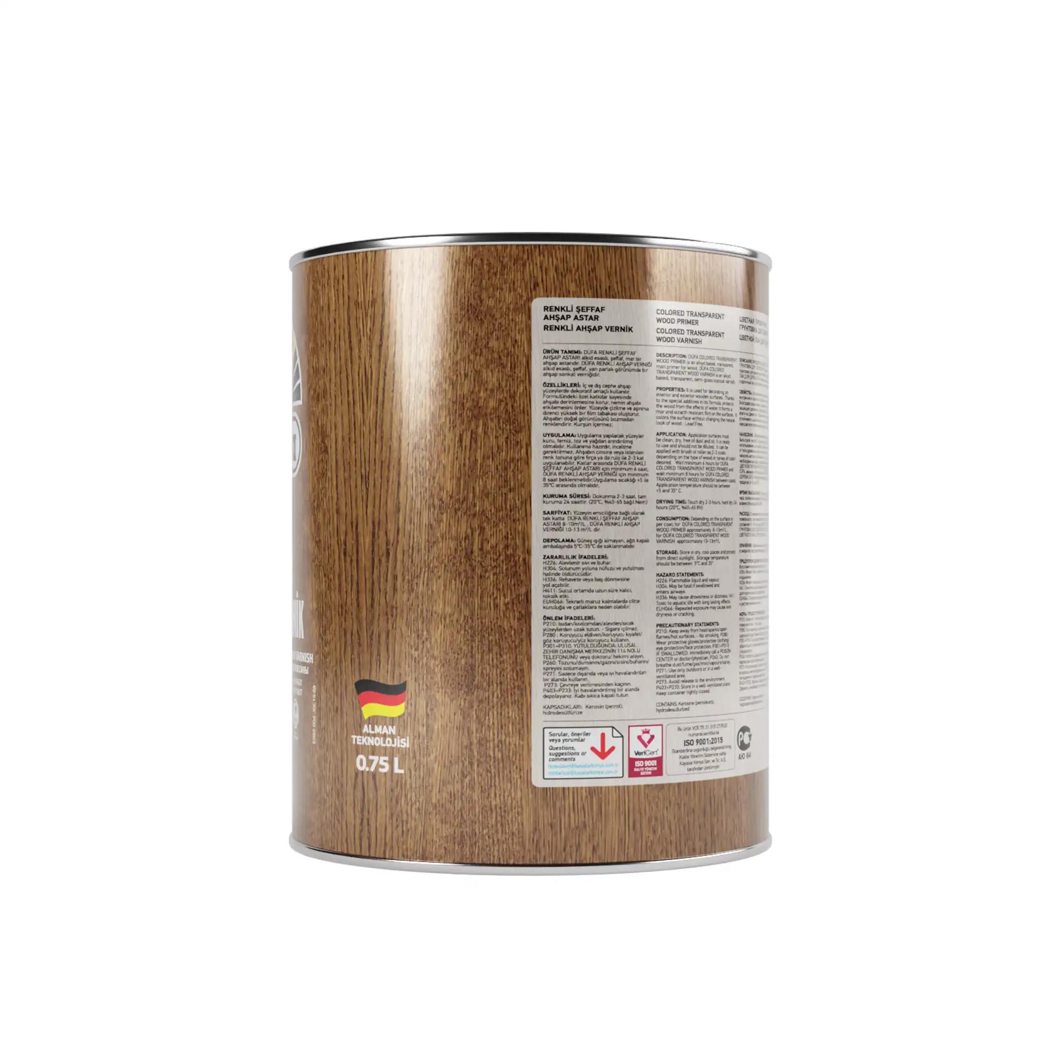 Şeffaf özellikte, yarı parlak görünümlü, son kat vernik. İç ve dış cephe ahşap yüzeylerde dekoratif amaçlı kullanılır. Yüzeyde çizilme ve aşınma direnci yüksek bir film tabakası oluşturur. Ahşabın doğal görüntüsünü bozmadan renklendiren dekoratif bir ahşap verniğidir. Kurşun içermez.